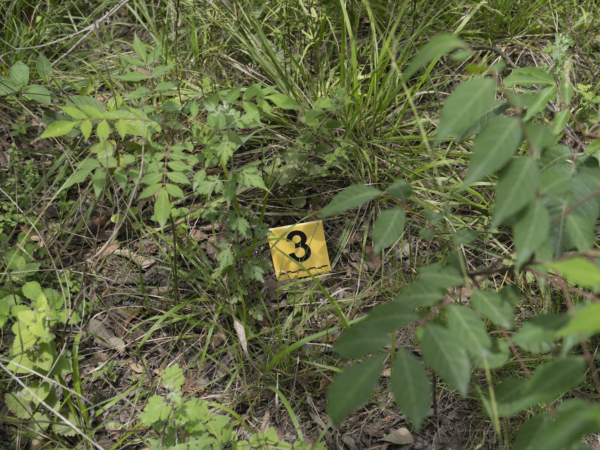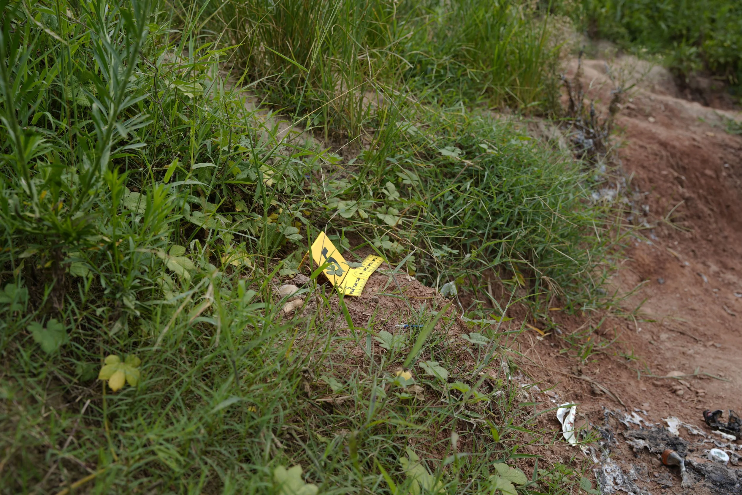 我们前往简阳清风乡黑址湾的小山上,把刻有上述文字的小石碑埋进土里,又在周围放置了一些犯罪现场勘验时所用的数字牌。小山脚下便是村民居所,不知何时会被他们发现,亦不知发现后是否会对相关历史(传说、故事)有讨论。